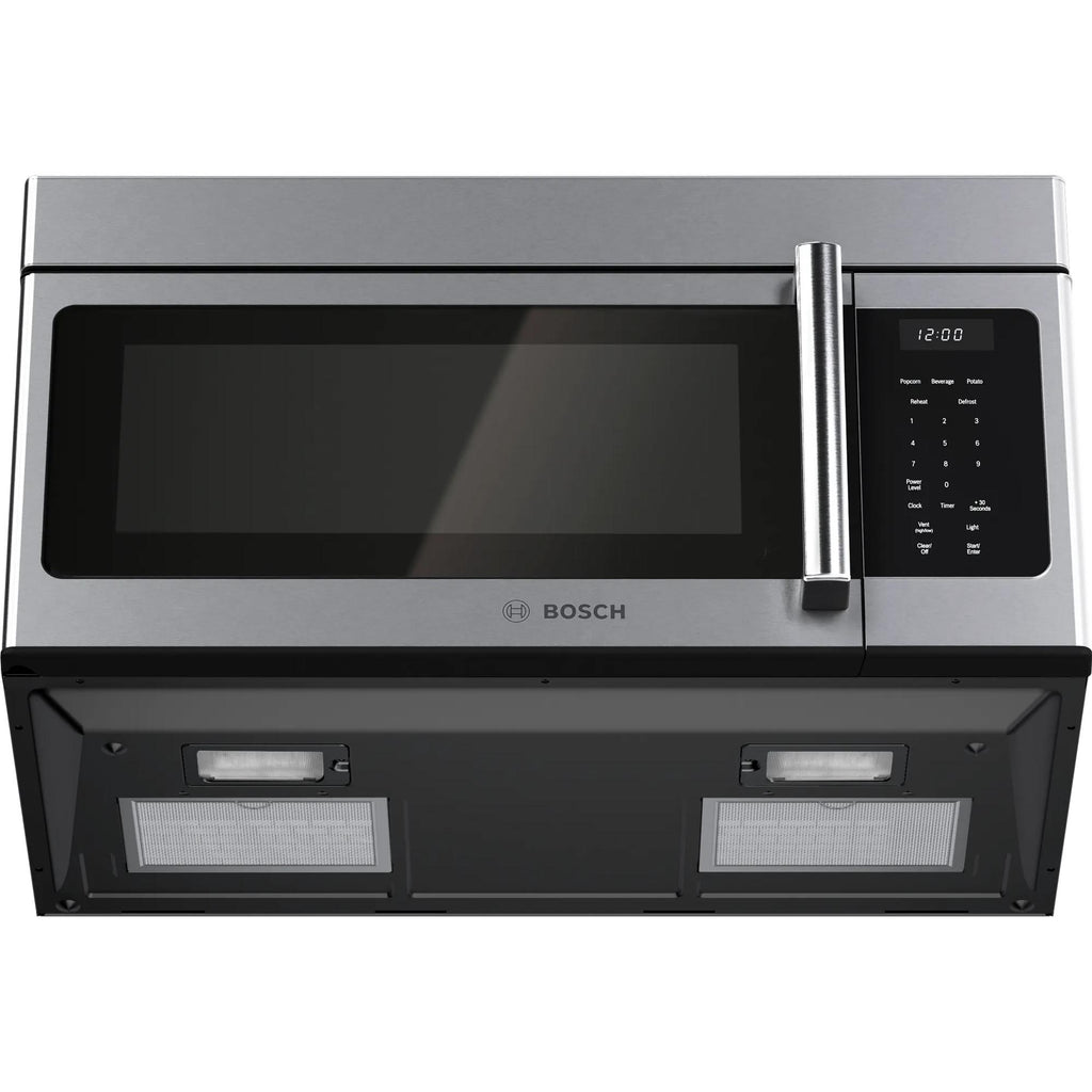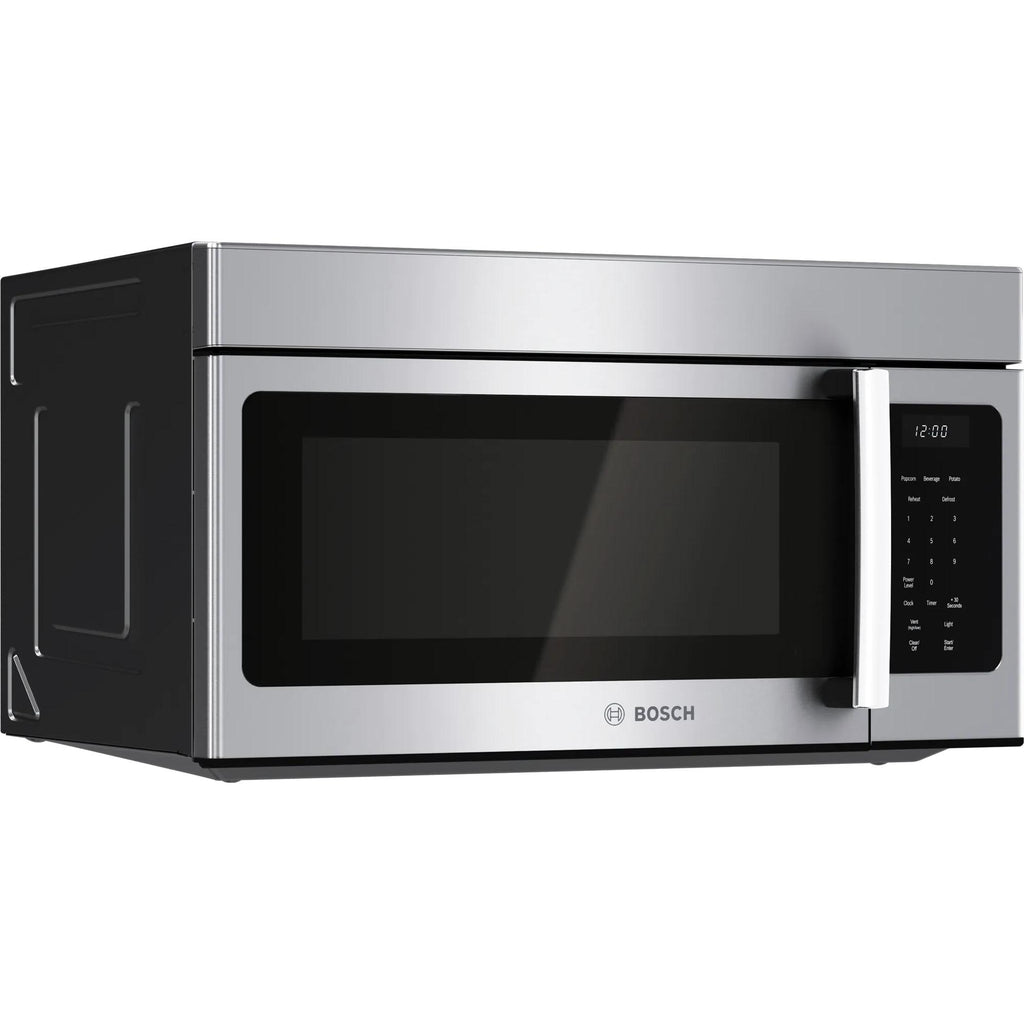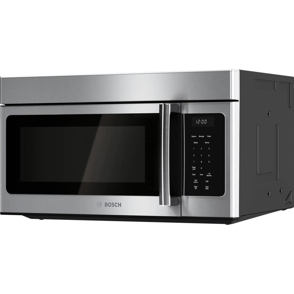 This Bosch 300 Series 30" over-the-range microwave with Left Side Opening Door. It features surface lighting to illuminate your range or ambient kitchen lighting, a large 1.7 cu. ft. capacity to fit a variety of dishes, 300 CFM vent efficiently that removes steam, smoke, grease and odors. This microwave offers a variety of modes including beverage reheat, potato and popcorn for easy and fast results.