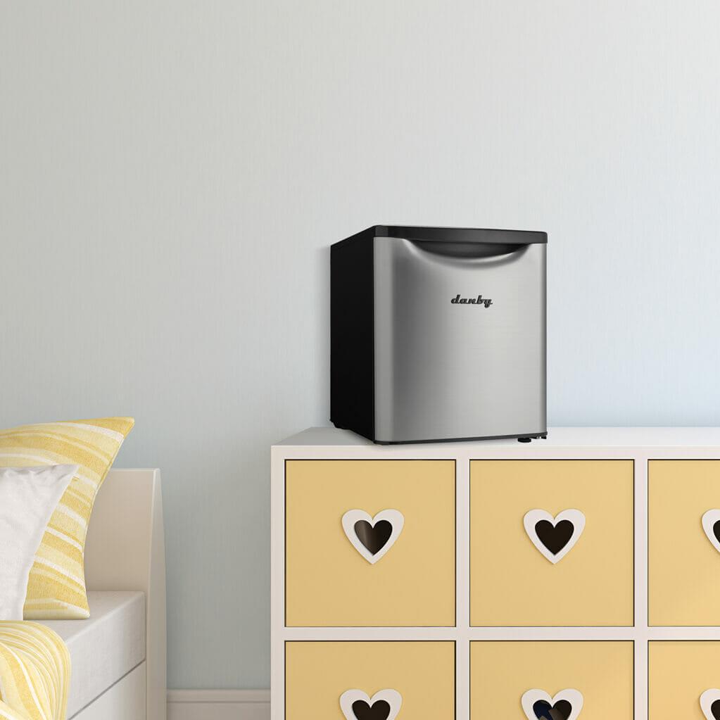 Danby Contemporary Classic collection 1.7 cu. ft. capacity compact all refrigerator. Drawing inspiration from mid-century styling and simplicity to reimagine retro for the modern consumer. Featuring interior white LED light, CanStor® beverage dispensing system and integrated door shelving with tall bottle storage.