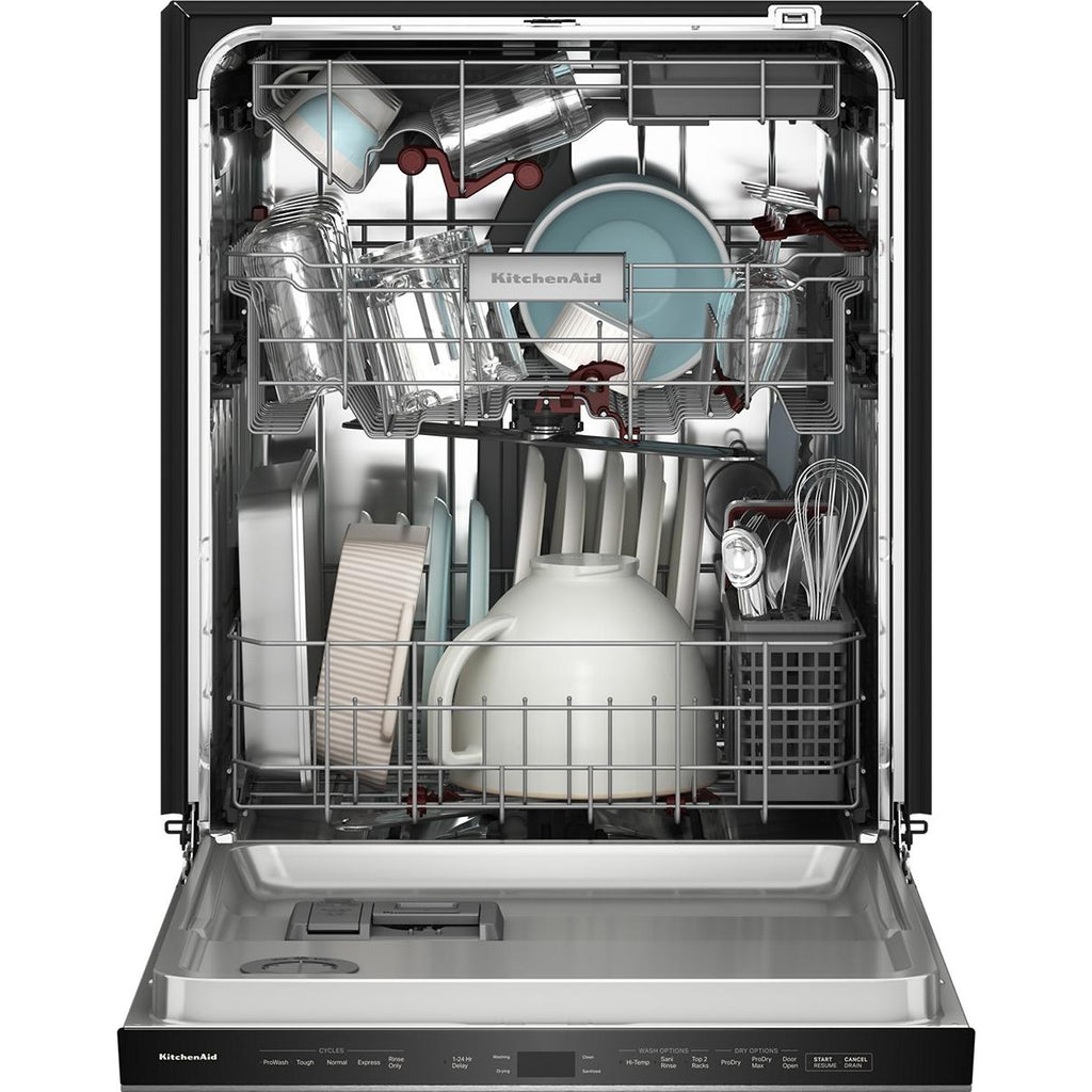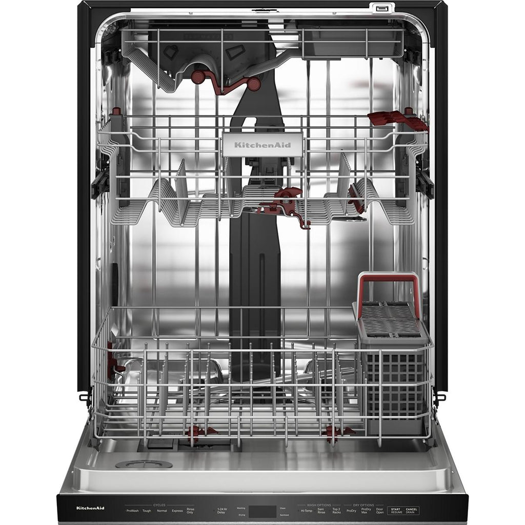 Say hello to the only way to dish. This top control dishwasher with a pocket handle has 50+ Total Wash Jets across 5 wash arms that offer targeted cleaning across the entire 7.25 cu.ft. MaxTub Largest dishwasher Tub*. 360° Max Jets™ Third Rack uses 360° wash jets to clean glasses, mugs and bowls. Advanced ProDry™ System serves up KitchenAid brand's driest dry. True Self-Cleaning Filtration eliminates manual filter cleaning by continuously circulating clean water during wash and rinse cycles.