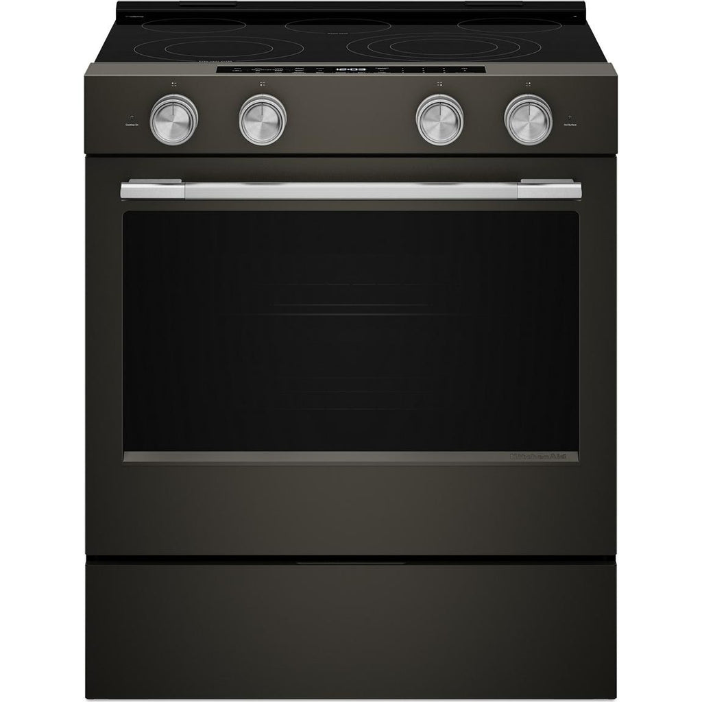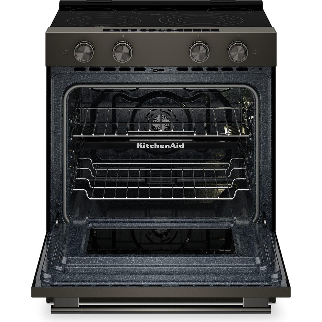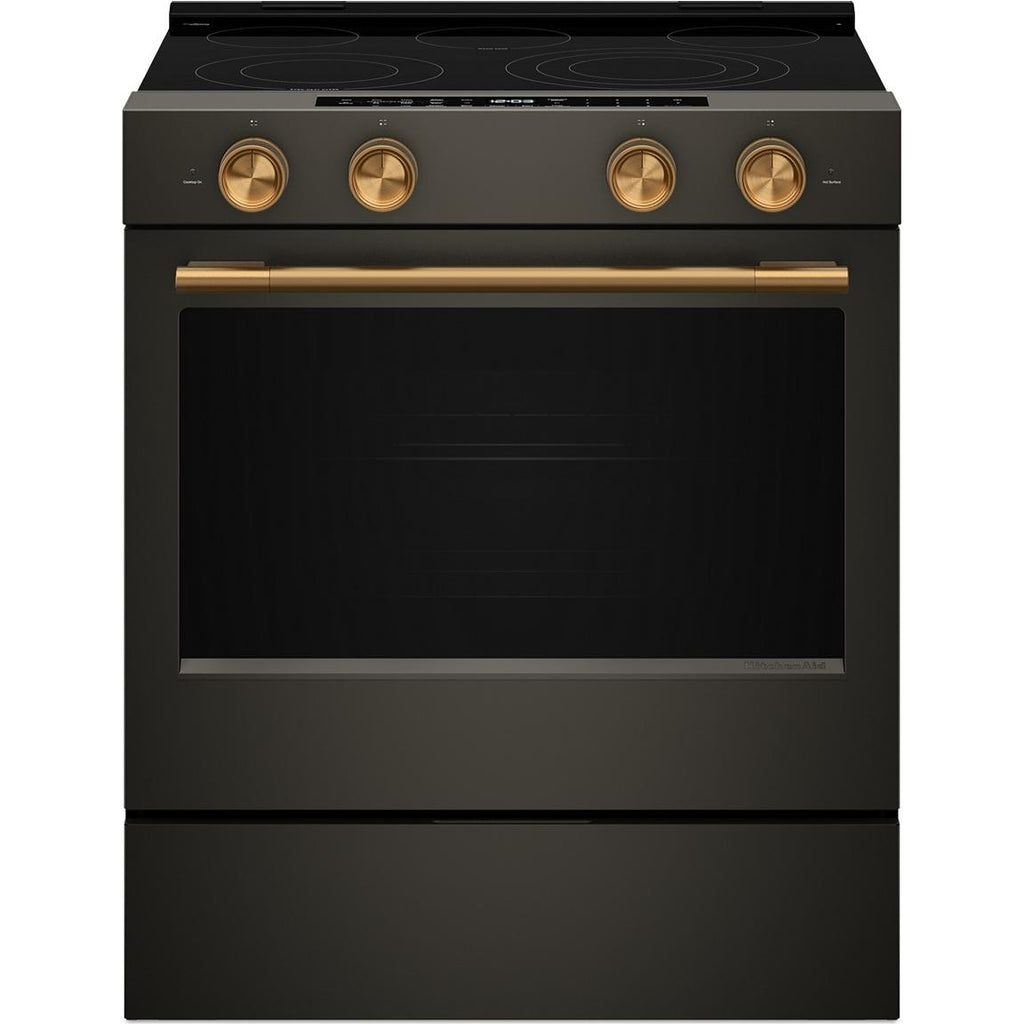 5.3 Cu. Ft. Smart Slide-in Electric Range with Two Even-Heat™ Hyper Elements and Convection Cooking Modes. Enjoy a range of possibilities with our most powerful KitchenAid 30-inch Electric Range available. Two Even-Heat™ Hyper Elements offer precise control and the versatility to take on large pots or small pans for various cooking tasks. A WiFi-enabled Smart Appliance featuring Convection Cooking Modes that help you get consistent results with optimal temperatures. A Steam Bake mode works with the included steam rack to provide additional moisture during baking, so you can enjoy Basque cheesecake and other delicious desserts. The range is designed to be personalized with a curated palette of exterior finishes and mixed metal hardware.