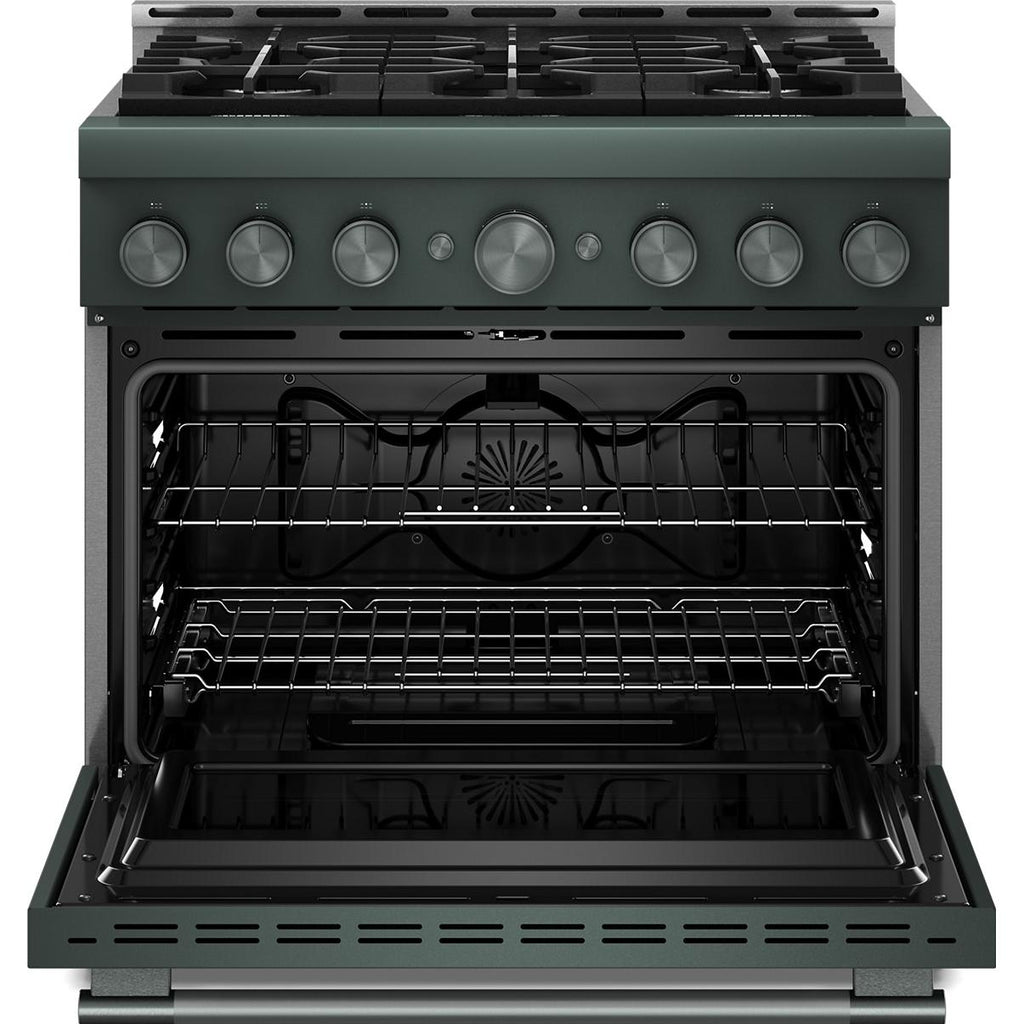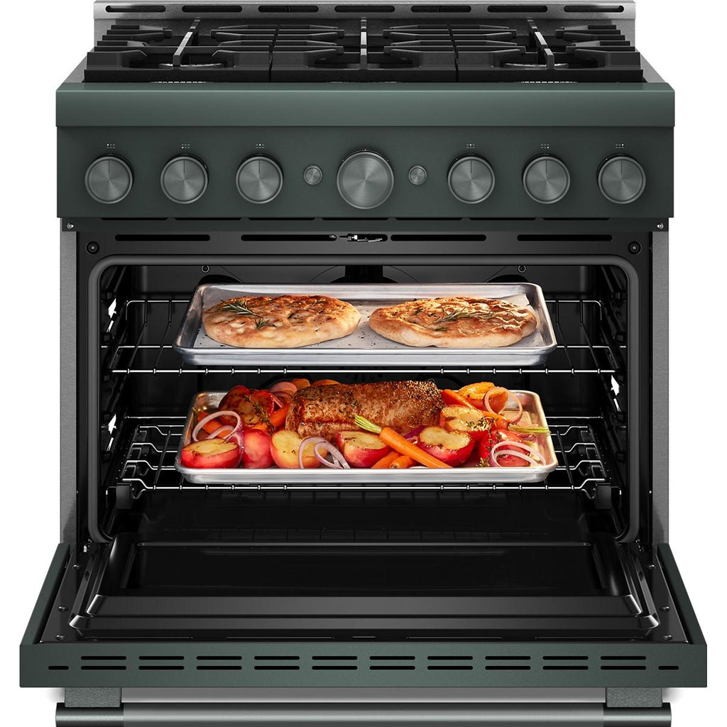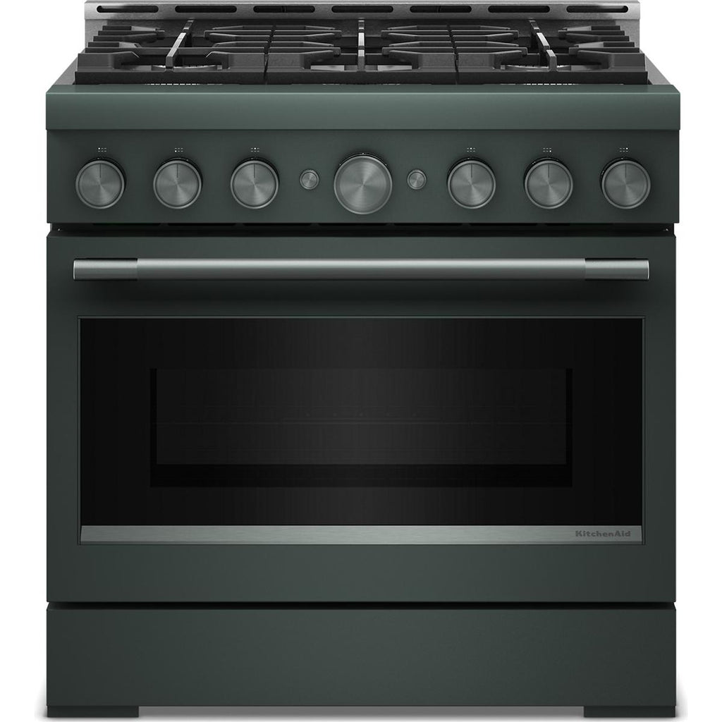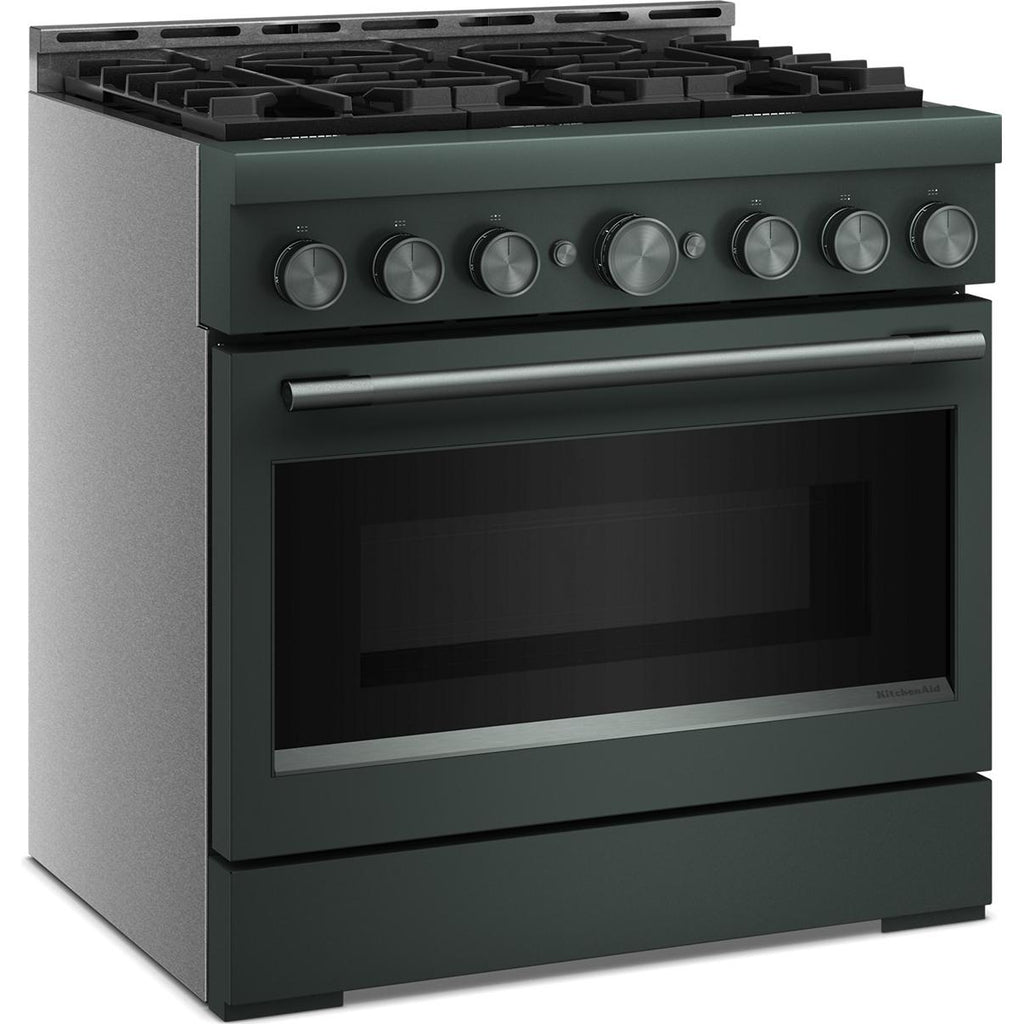 Expand your skills with a 36-inch KitchenAid® Commercial-Style Range with 6 burners. This gas range features two versatile 20,000 BTU Ultra Power™ Dual-Flame Burners with the power and precision needed to successfully sear, simmer, stir-fry and sauté. Even-Heat™ True Convection gives consistent baking and roasting, plus air fry mode that yields crispy, golden results.