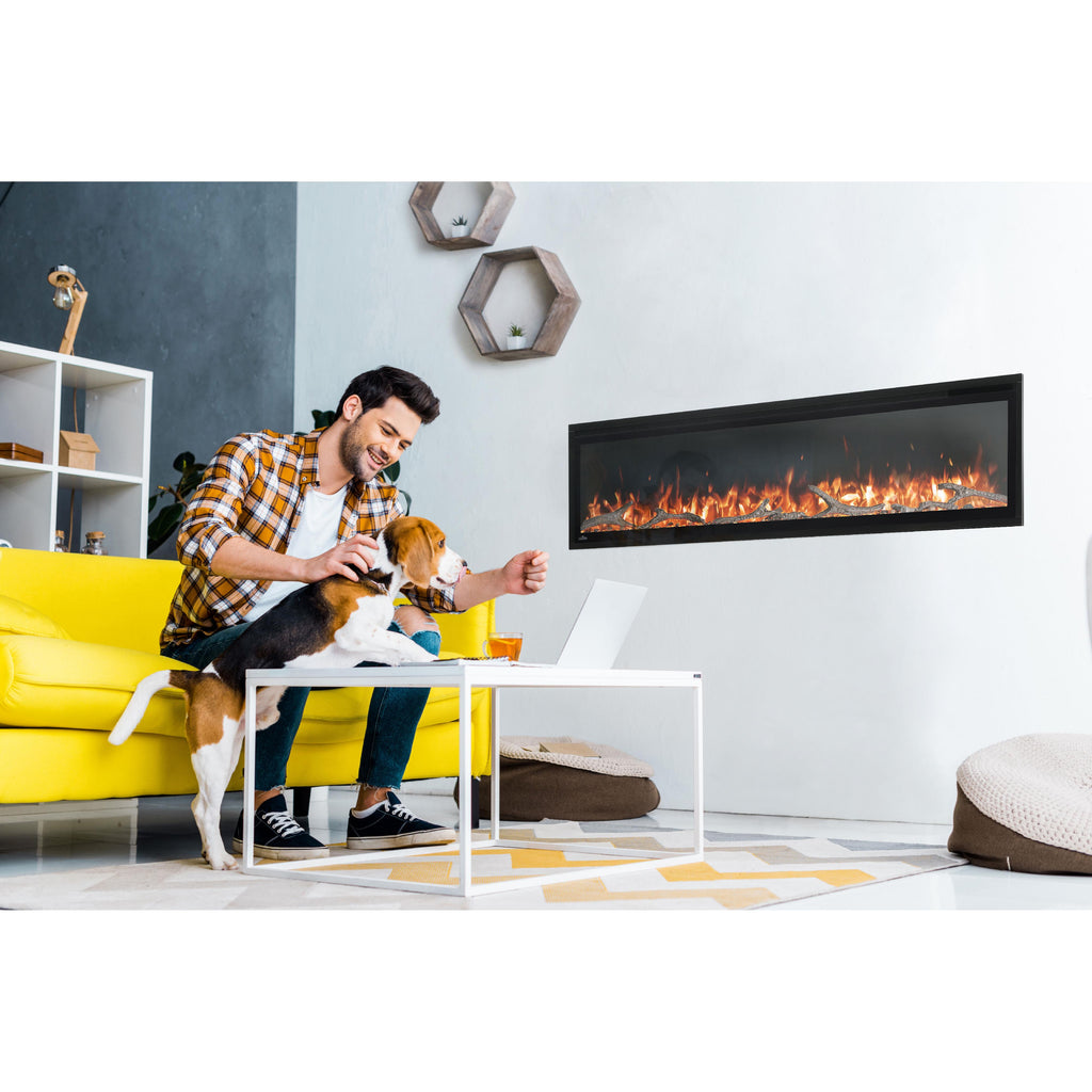 Completely transform any space with the Entice 60 Wall-Hanging Electric Fireplace. The full flame pattern creates a striking visual impact, especially with the ability to change the flame color and ember bed to match your mood and style. Have full control over your fireplace with the remote, easily adjusting the flame intensity, colors, ember bed color, brightness, blower, heat output, and timer. Ready to go right out of the box, no gas fitter required, just hang the Entice on the wall and plug in. The shallow depth means that this fireplace doesn't intrude into your living space. A reflective rear panel expands the depth of the flames for a more immersive experience without taking up physical space in your room. For a more seamless look, this electric fireplace can be fully or partially recessed into a wall. See the fireplace and not the frame with a minimalist, nearly frameless finish. Complete any room with an easy-to-install Entice 60 Wall-Hanging Electric Fireplace.