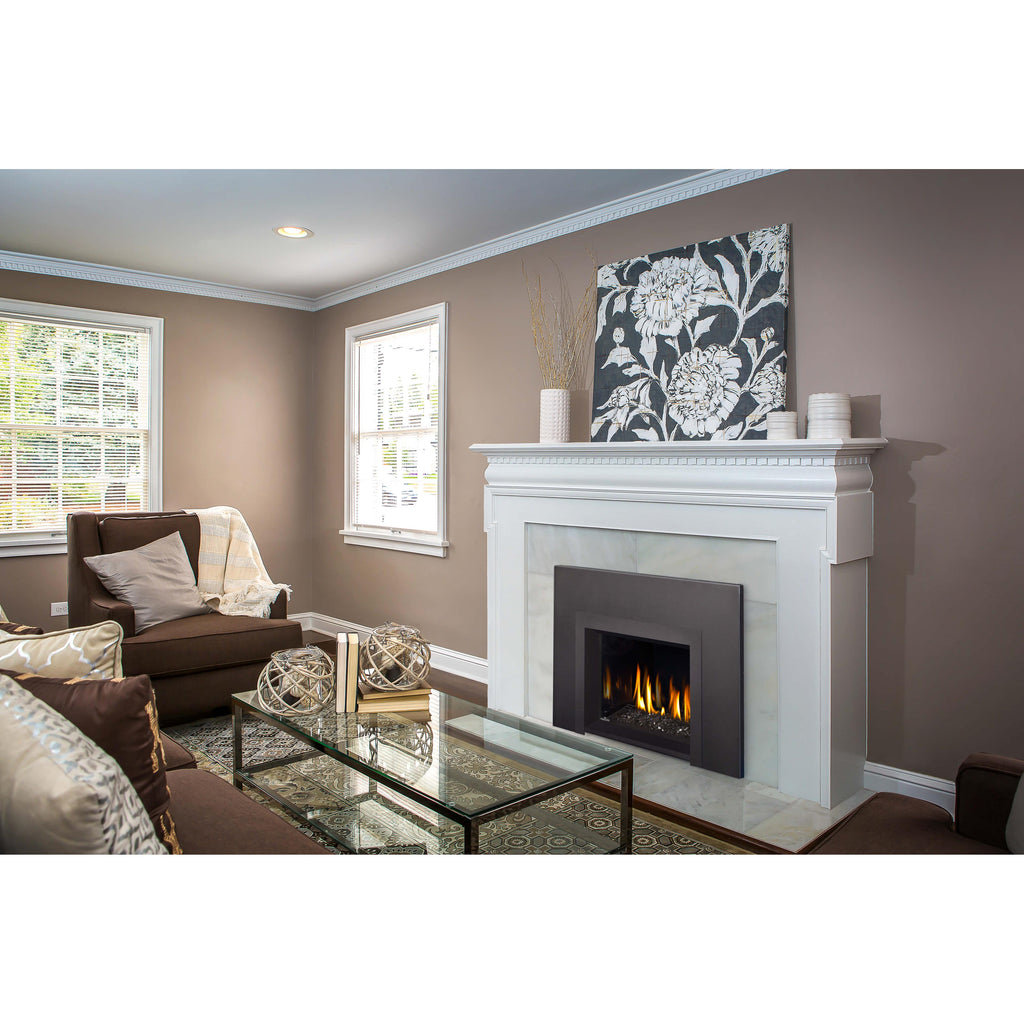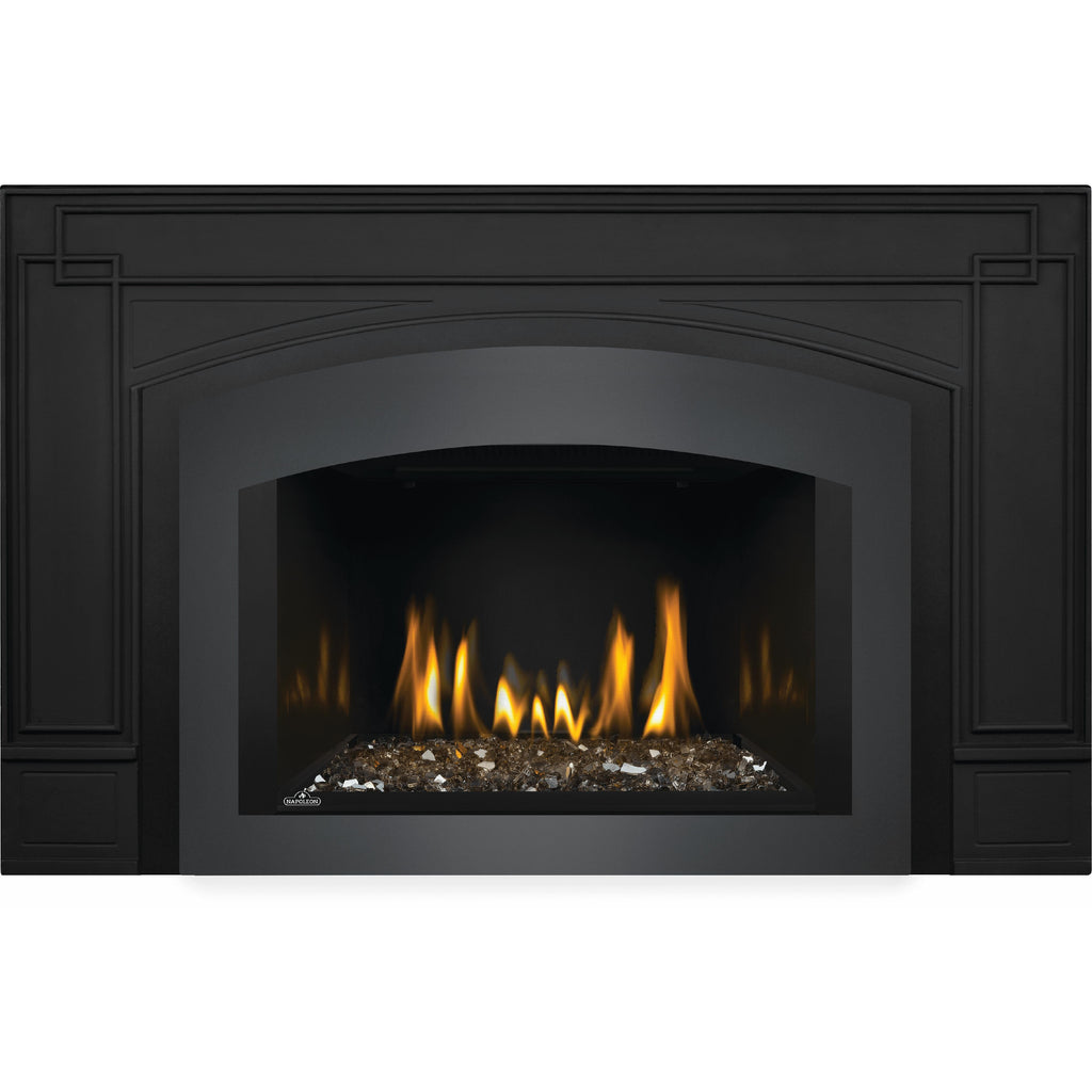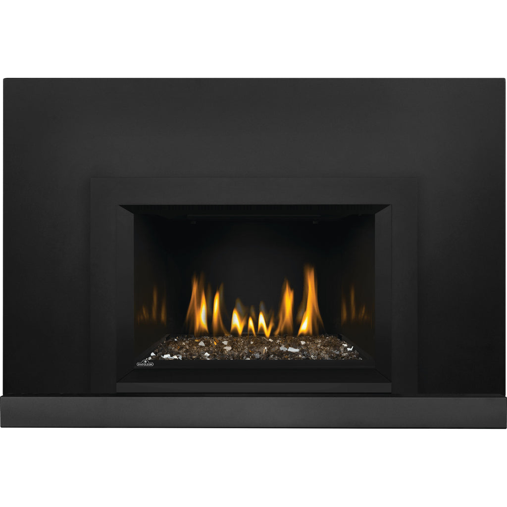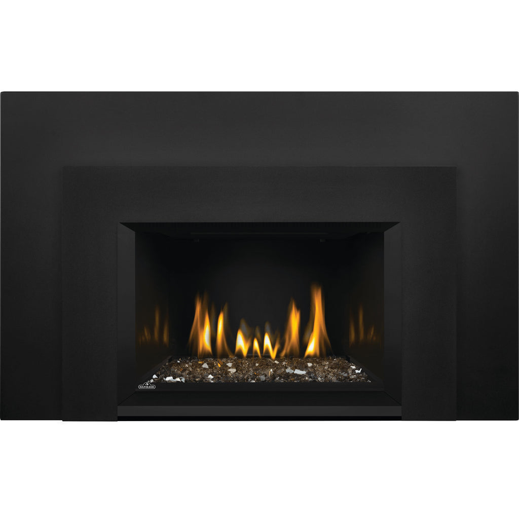 A sparkling, modern fireplace with glass ember bed will add much-needed luxe to your favorite spaces when you install an Oakville™ Gas Insert with Glass Ember Bed. The exclusive NIGHT LIGHT™ and MIRRO-FLAME Porcelain Reflective Radiant Panels provide the luxury of a deep firebox while creating a warm and relaxing atmosphere. This is helped by the ability of this firebox to be slid all the way back into the existing fireplace opening. This fireplace insert is the perfect solution for an economical heating source, complemented with the modern elegance of a sparkling Topaz CRYSTALINE™ ember bed. A multitude of decorative designer accessories are also available to match any room in your home. Heating smarter and saving energy doesn’t have to mean compromising great design.
