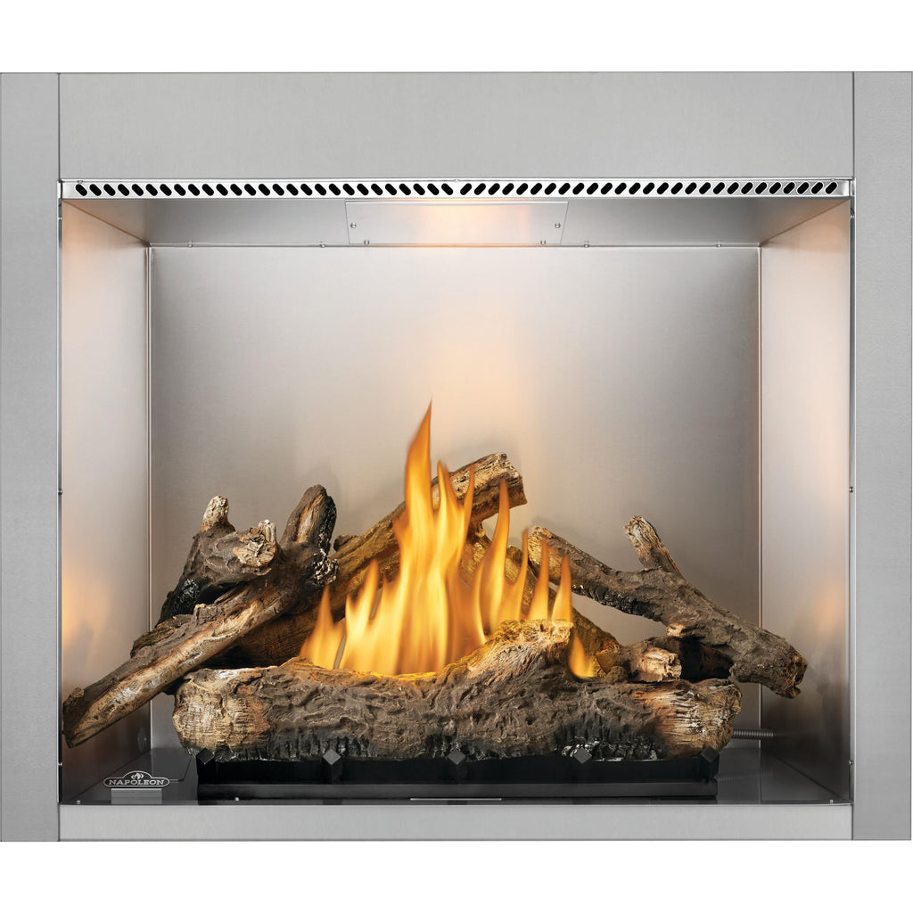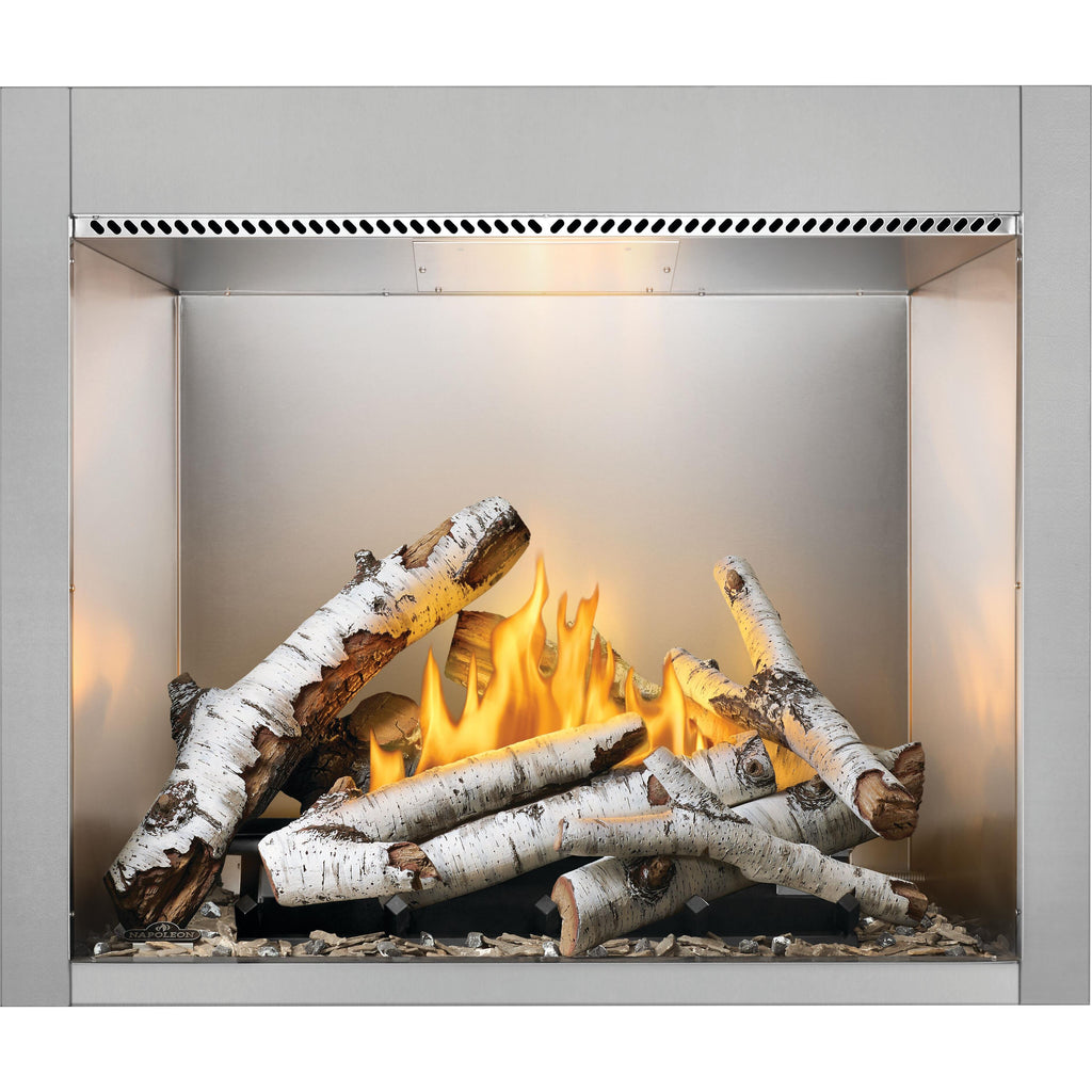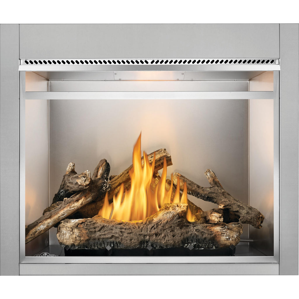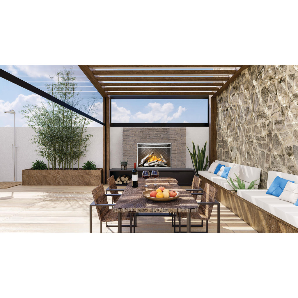 Elevate your outdoor living space with the Riverside 42 Outdoor Gas Fireplace. Featuring up to 60,000 BTUs of heat, this traditional fireplace combines clean-face, contemporary looks with outstanding performance. Increase design flexibility and control by including our Prestige® heat and exhaust management system, optimizing heat distribution, and customizing settings to suit your preferences. The finishing flange flange completes the full-view appearance providing a seamless look. Choose from Standard Oak or High Definition Birch Log Sets to create the perfect ambiance. Add sophistication with optional Newport Standard™ or Westminster™ Grey Herringbone decorative panels. Experience hassle-free operation with the external control panel, optional remote, or the optional outdoor timer. Include the stainless steel cover or screen kit for added safety and longevity. Experience an outdoor fireplace that combines style, functionality, and convenience.