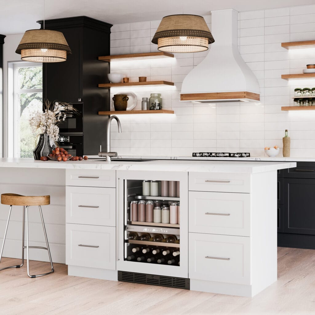 Built-in design stores up to 79 beverage cans and 19 standard bordeaux wine bottles Panel-Ready door for seamless integration with... Built-in design stores up to 79 beverage cans and 19 standard bordeaux wine bottles Panel-Ready door for seamless integration with cabinetry. Dual Zone: Perfect blend of wine & beverage storage Temperature Range Upper: 34°F – 50°F (1°C – 10°C). Temperature Range Lower: 50°F – 64°F (10°C – 18°C). Patent pending wine shelf, with adjustable bottle spacing. Soft-close, full extension wine shelf. Zero-clearance hinges; field-reversible door swing. Optimized shelf spacing for tall cans. Shelf space for upright storage of tall bottles. Anti-glare LED side lighting.    Compare View more