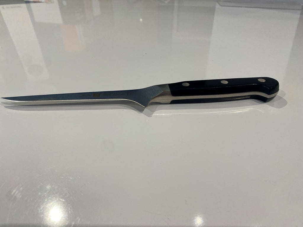 This 5.5-inch boning knife features a long, thin, flexible blade for precision trimming when separating meat from bones and joints.